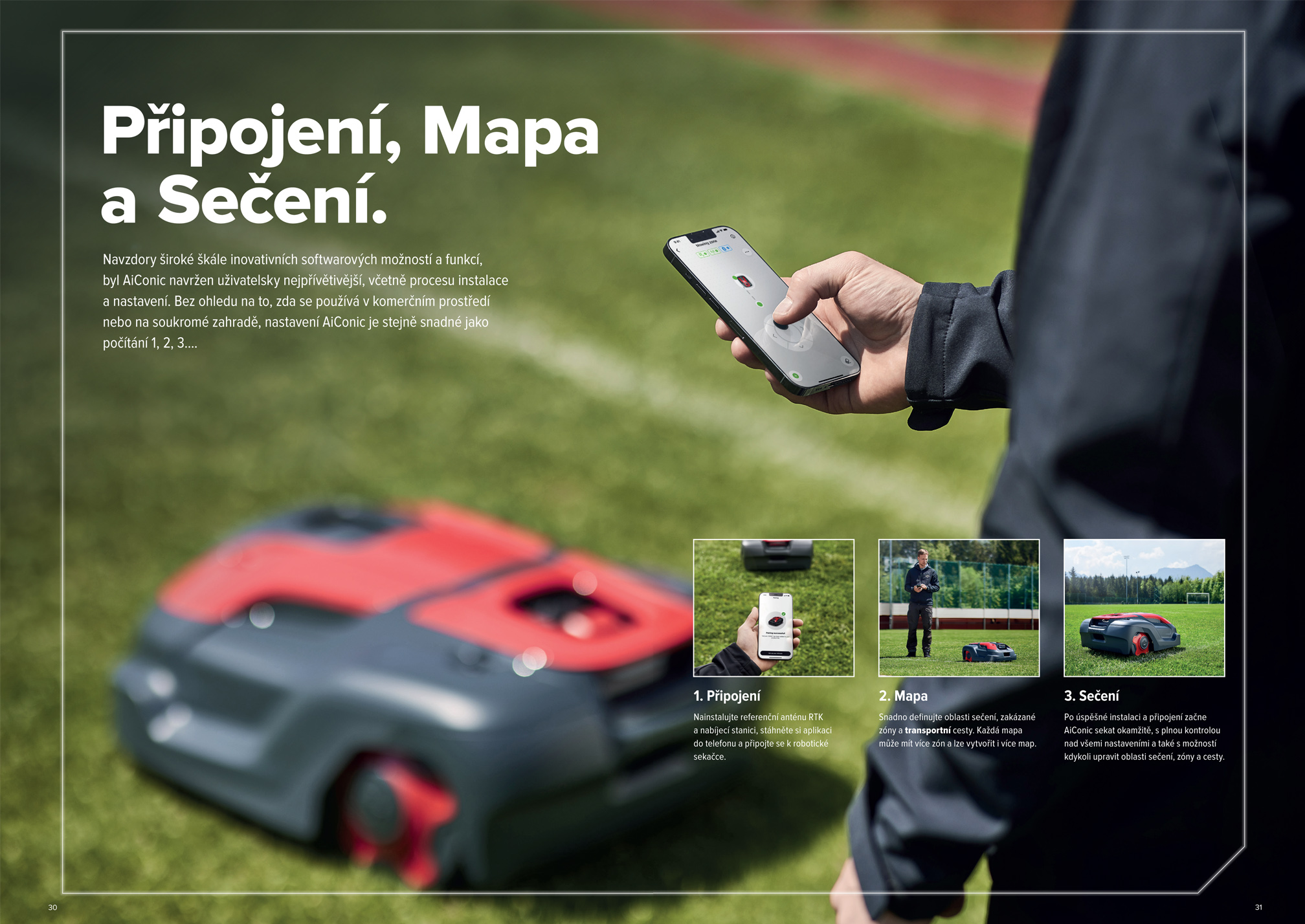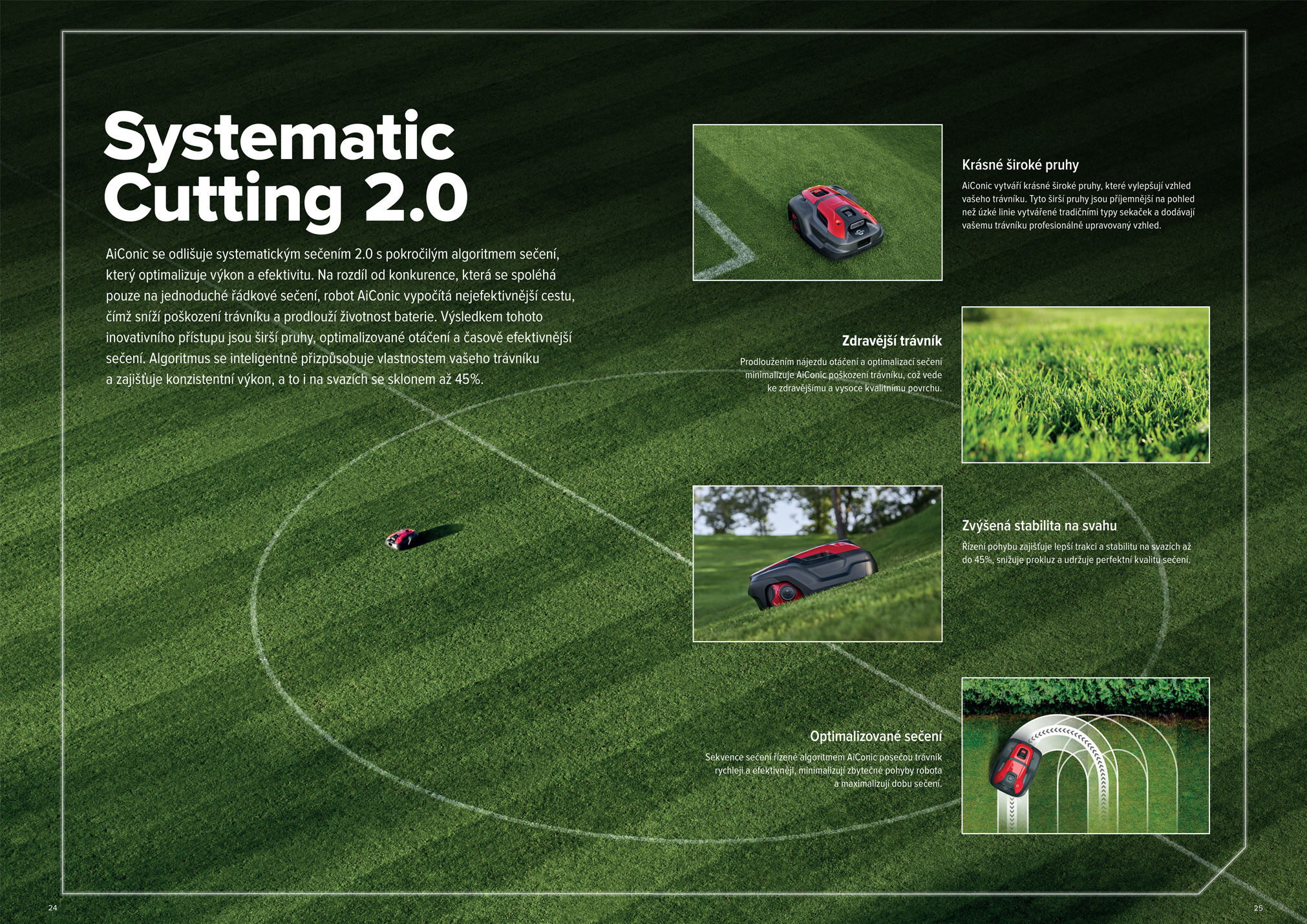 uživatele. AiConic má další výhodu v tom, že používá umělou inteligenci k detekci překážek a také využívá řadu senzorů, které vždy znají její přesnou polohu a optimalizují vzorec sečení tím nejefektivnějším způsobem.