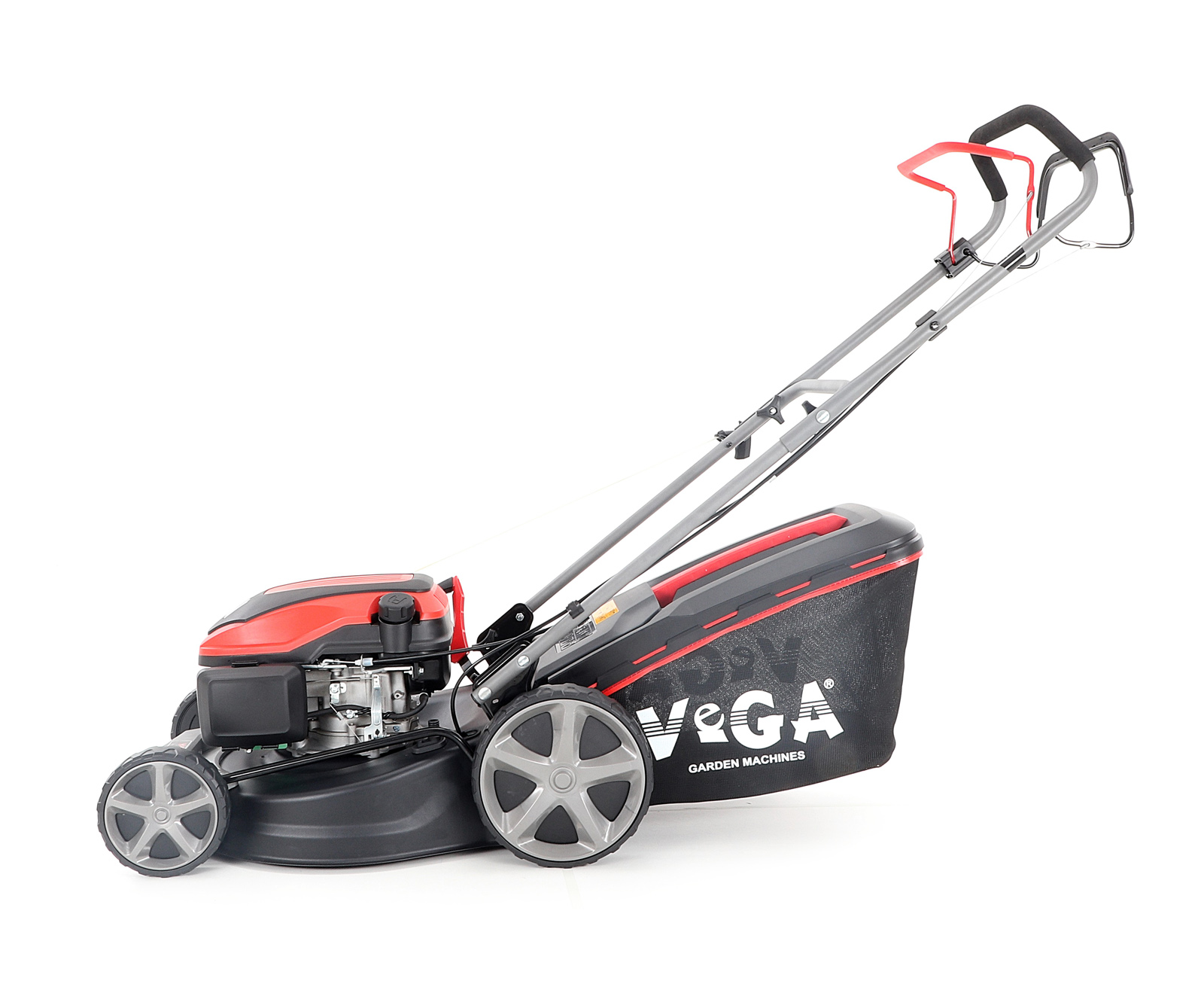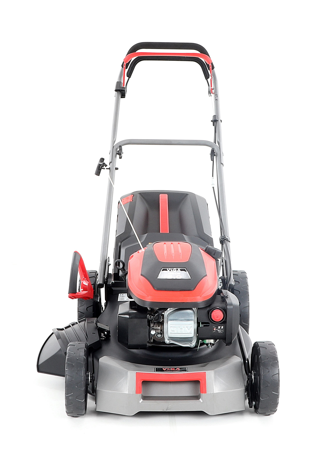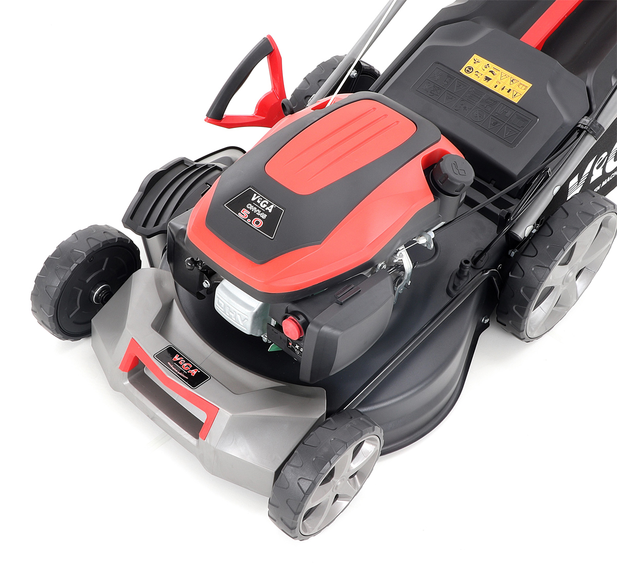 Velká zadní pojezdová kola i přední kola jsou uložena v oboustranných kuličkových ložiscích, centrální nastavení výšky sečení je u značky VeGA také samozřejmostí, jako ergonomické měkčené madlo.